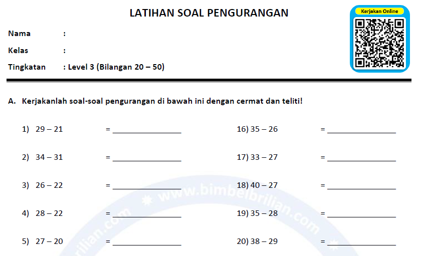 => Download Soal Isian Pengurangan Level 3 Bilangan 20 sampai 50 dan Kunci Jawaban