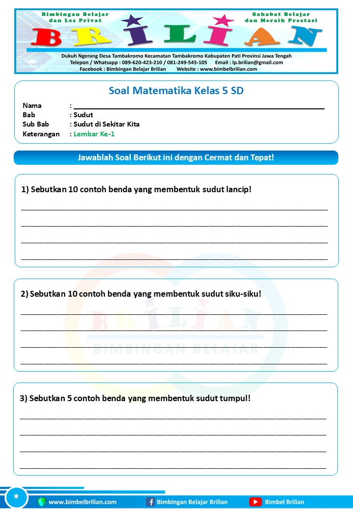Soal Lembar Ke-1 Soal Bab Sudut di Sekitar Kita (Sudut pada Jalan, Sudut pada Benda, dan Sudut antar Posisi Benda