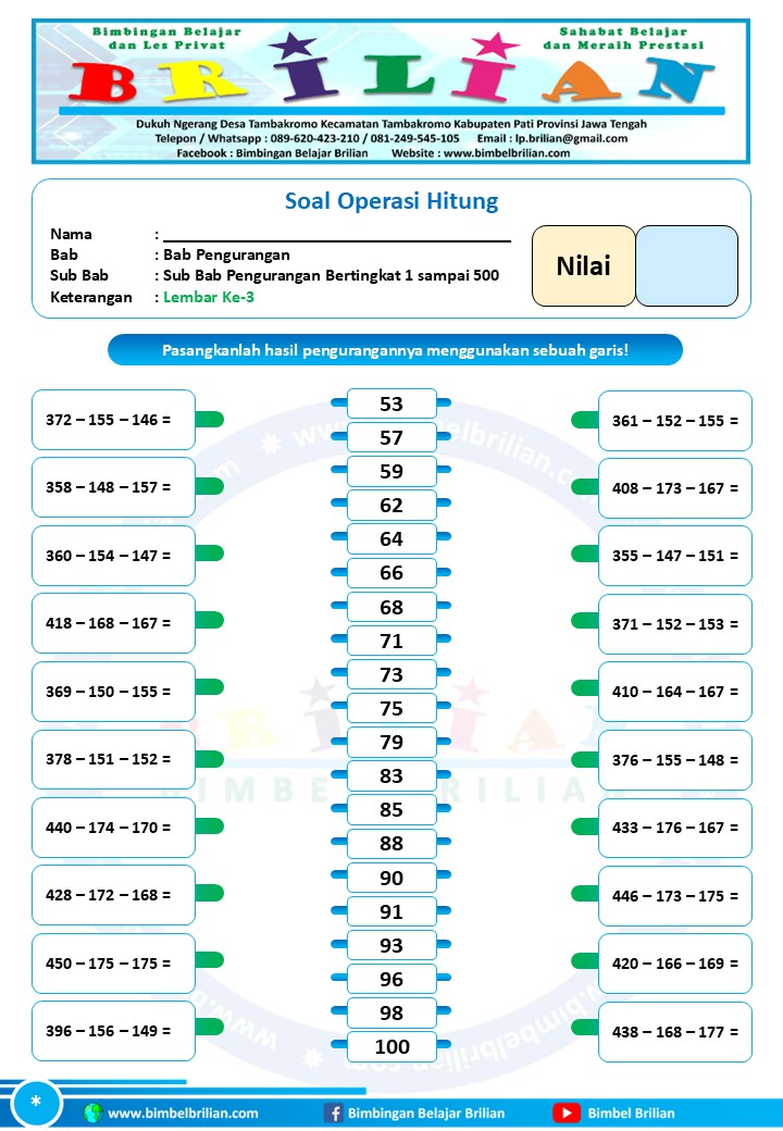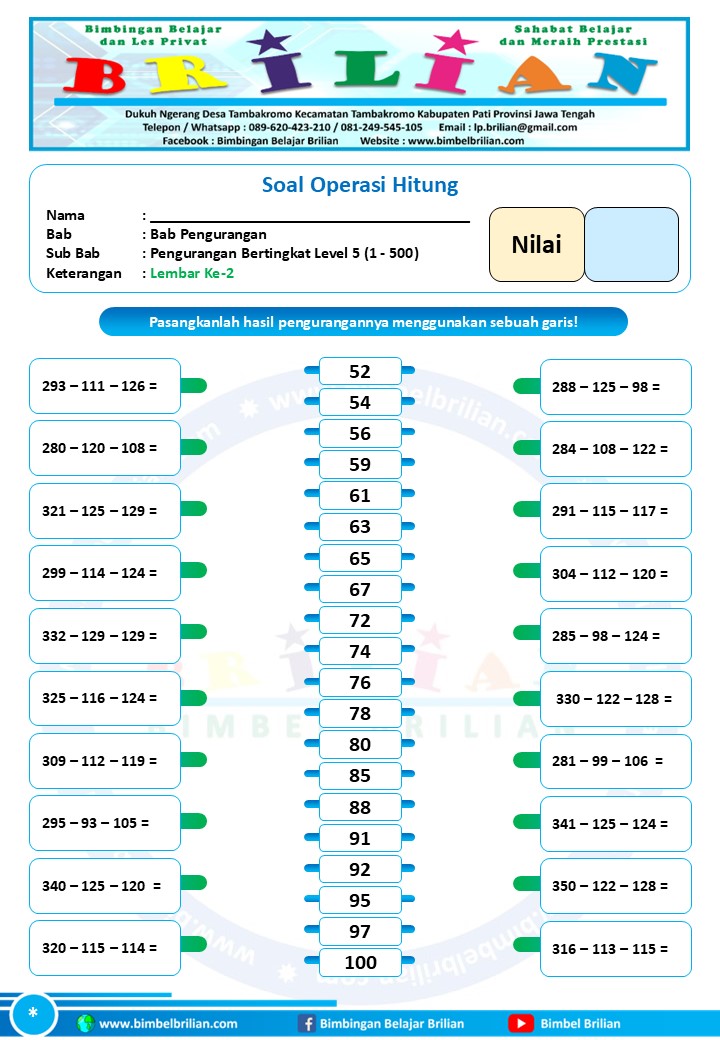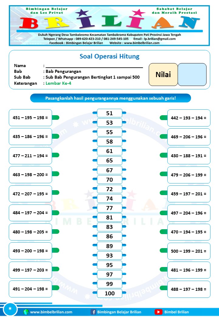 => Download Soal Math Matching Game Pengurangan Bertingkat Level 5 Bilangan 1 Sampai 500 (Memasangkan dengan Garis) dan Kunci Jawaban