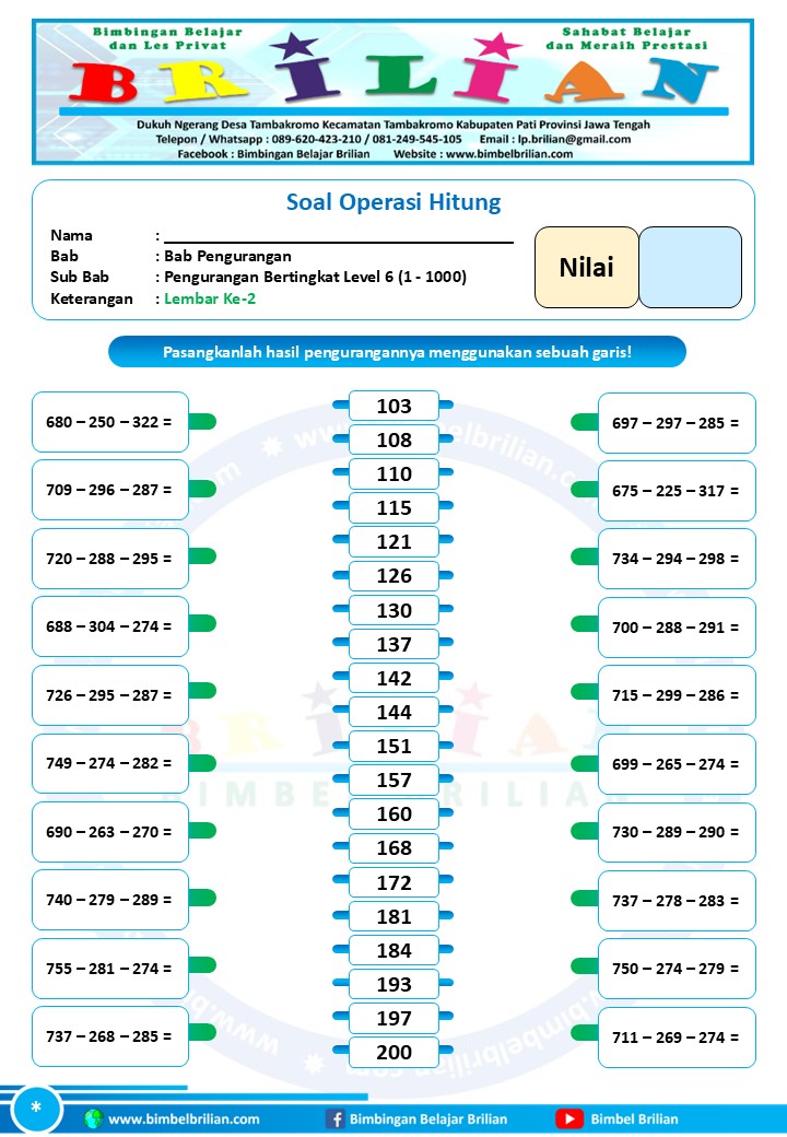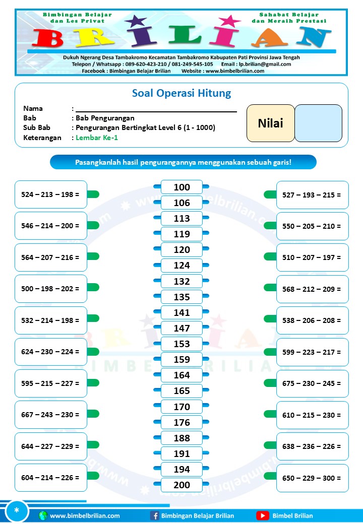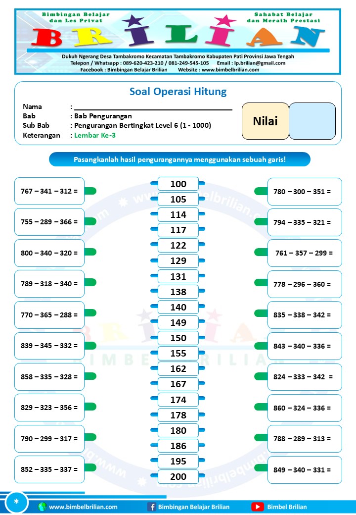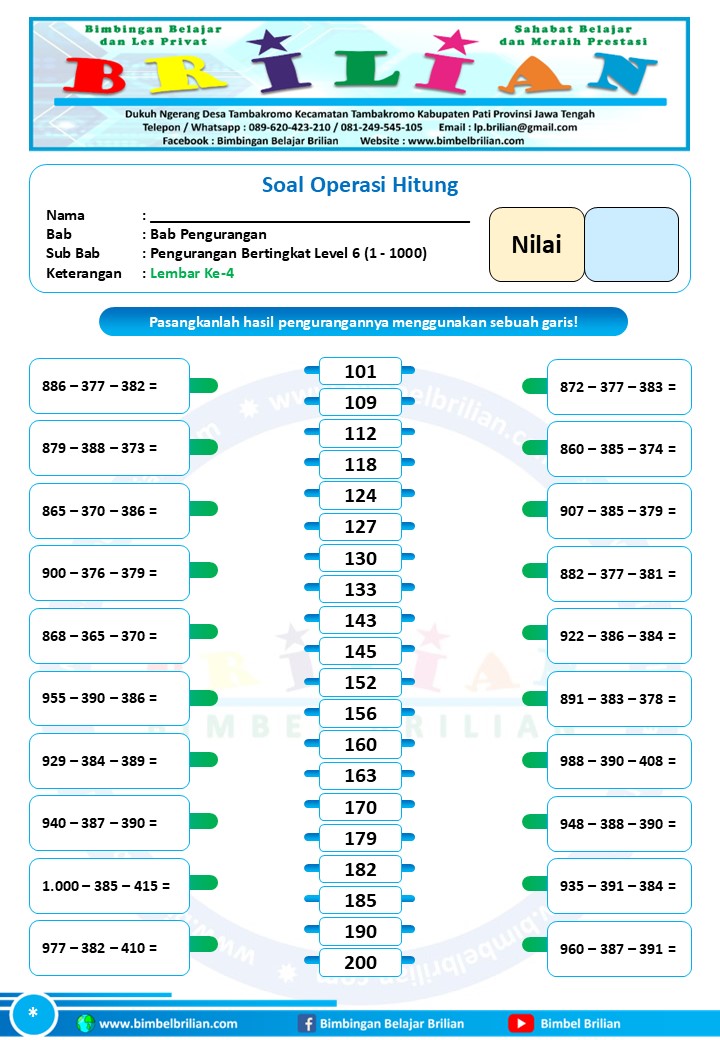 => Download Soal Math Matching Game Pengurangan Bertingkat Level 6 Bilangan 1 Sampai 1.000 (Memasangkan dengan Garis) dan Kunci Jawaban