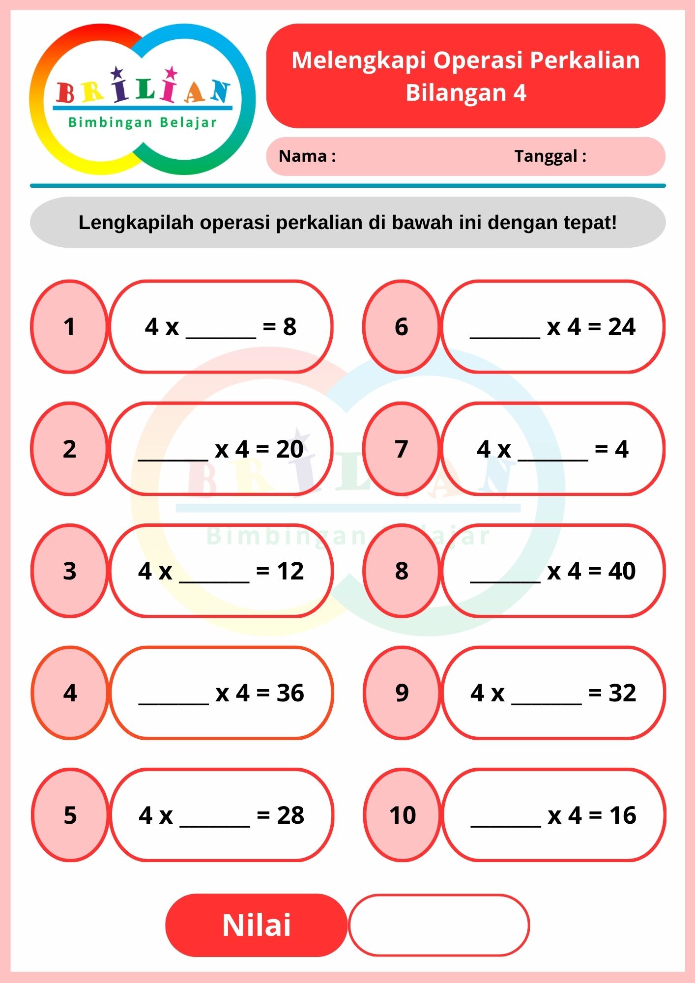 => Kumpulan Soal Melengkapi Operasi Perkalian (44 Lembar)