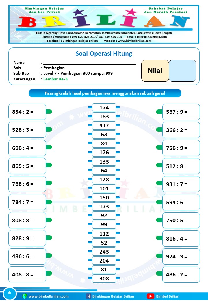 => Download Soal Level 7 Bilangan 3 Angka (300 sampai 999) dengan 1 Angka Dilengkapi Kunci Jawaban