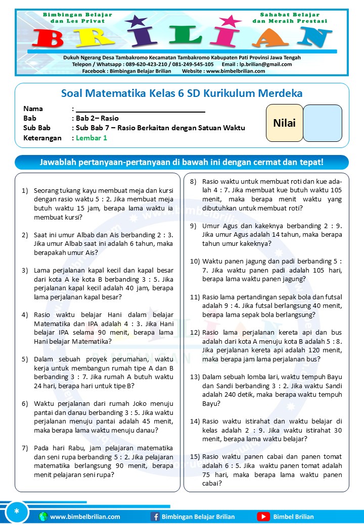 => Soal Online Rasio dan Perbandingan pada Satuan Waktu Lembar 1 Kelas 6 SD Langsung Ada Nilainya