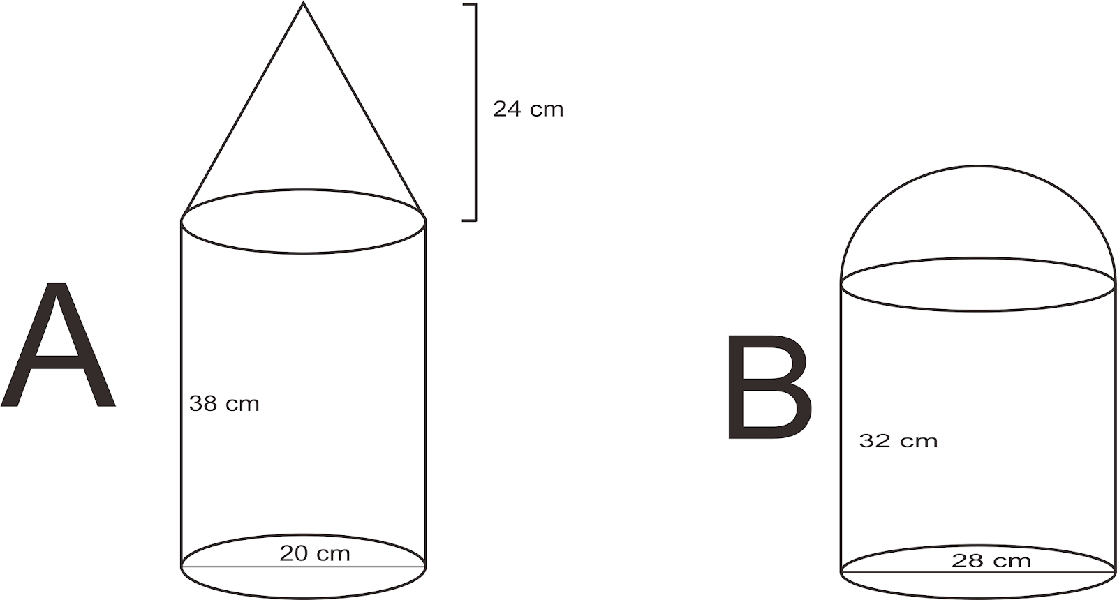 – Volume bangun A = Volume tabung + Volume kerucut
