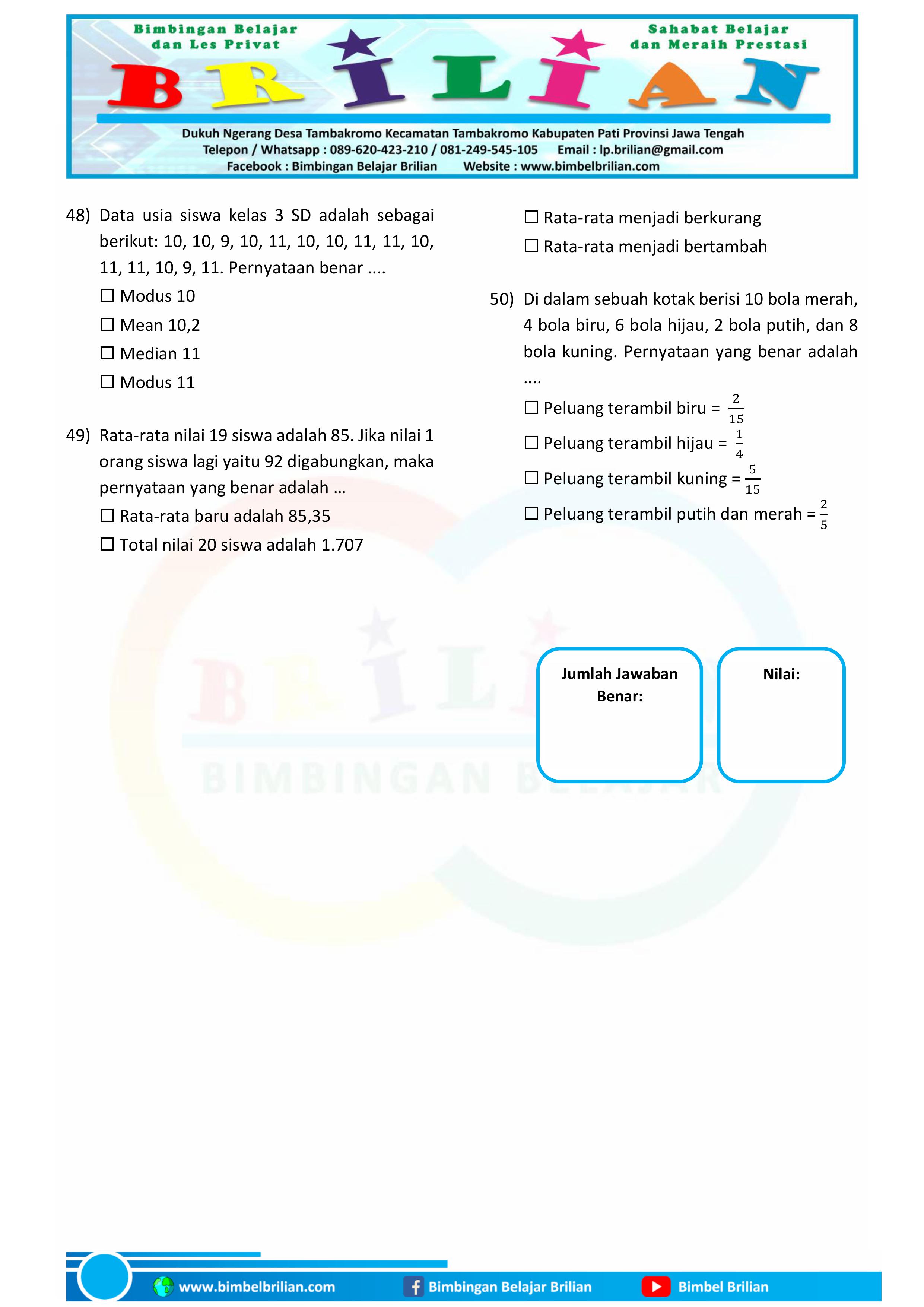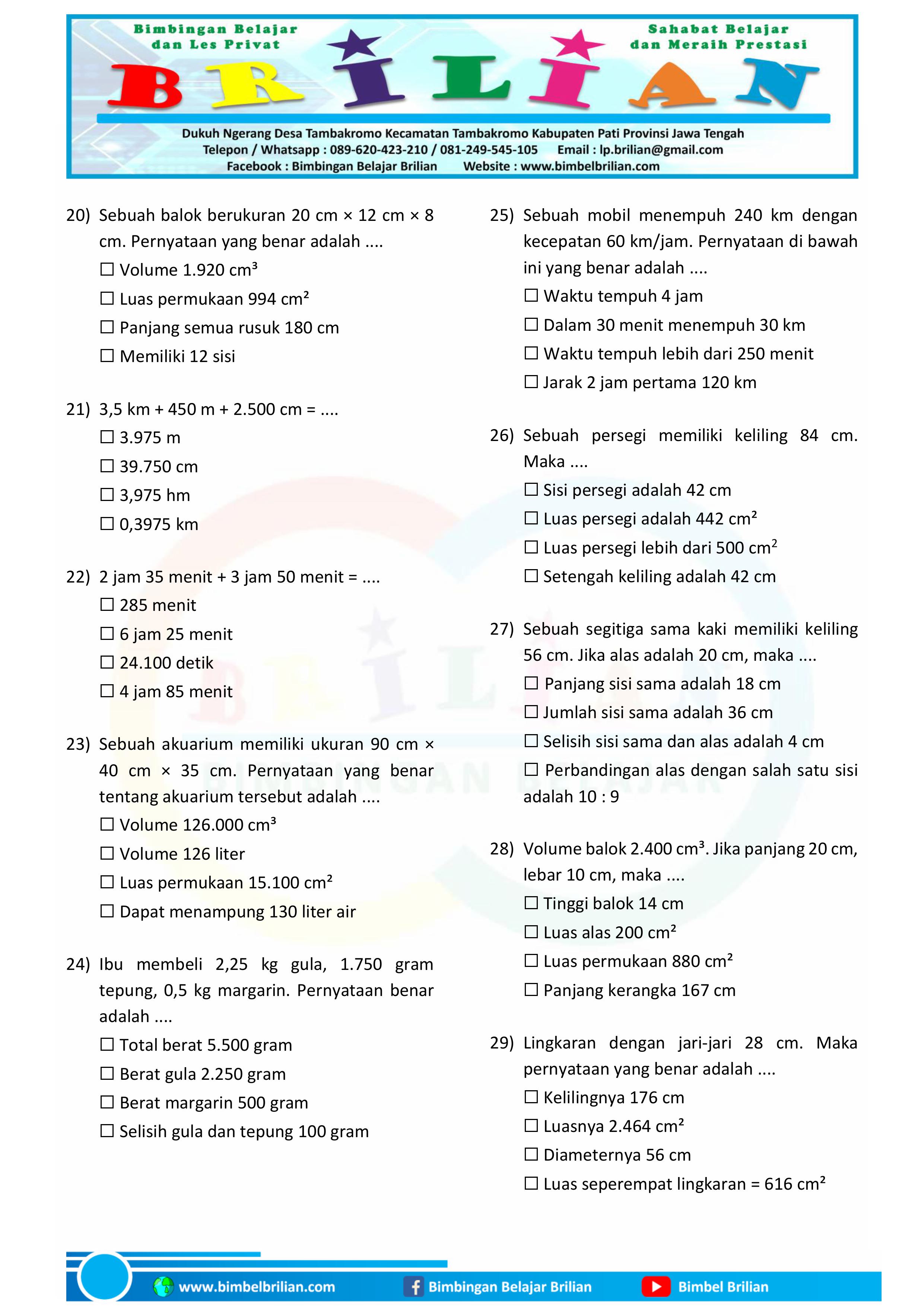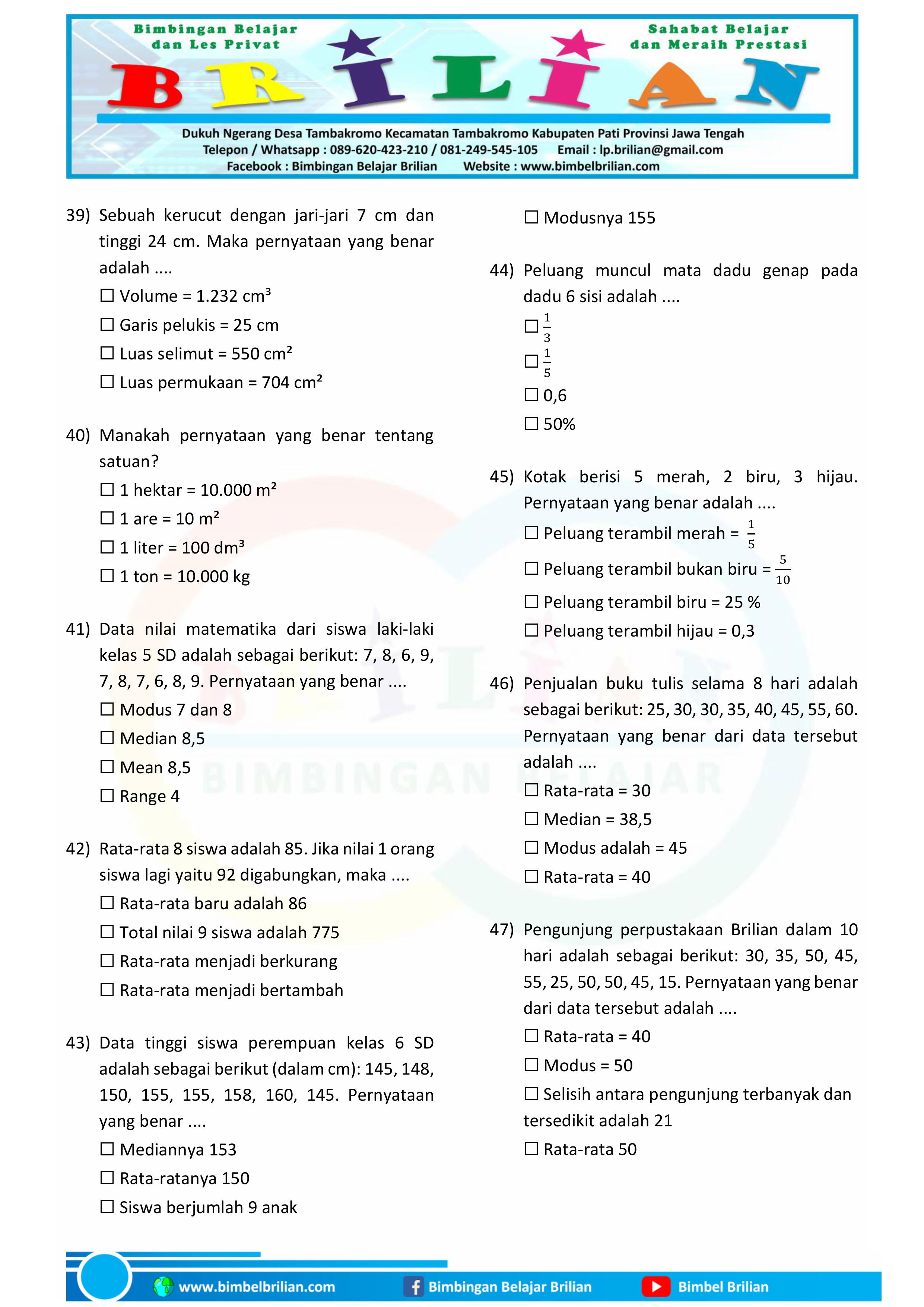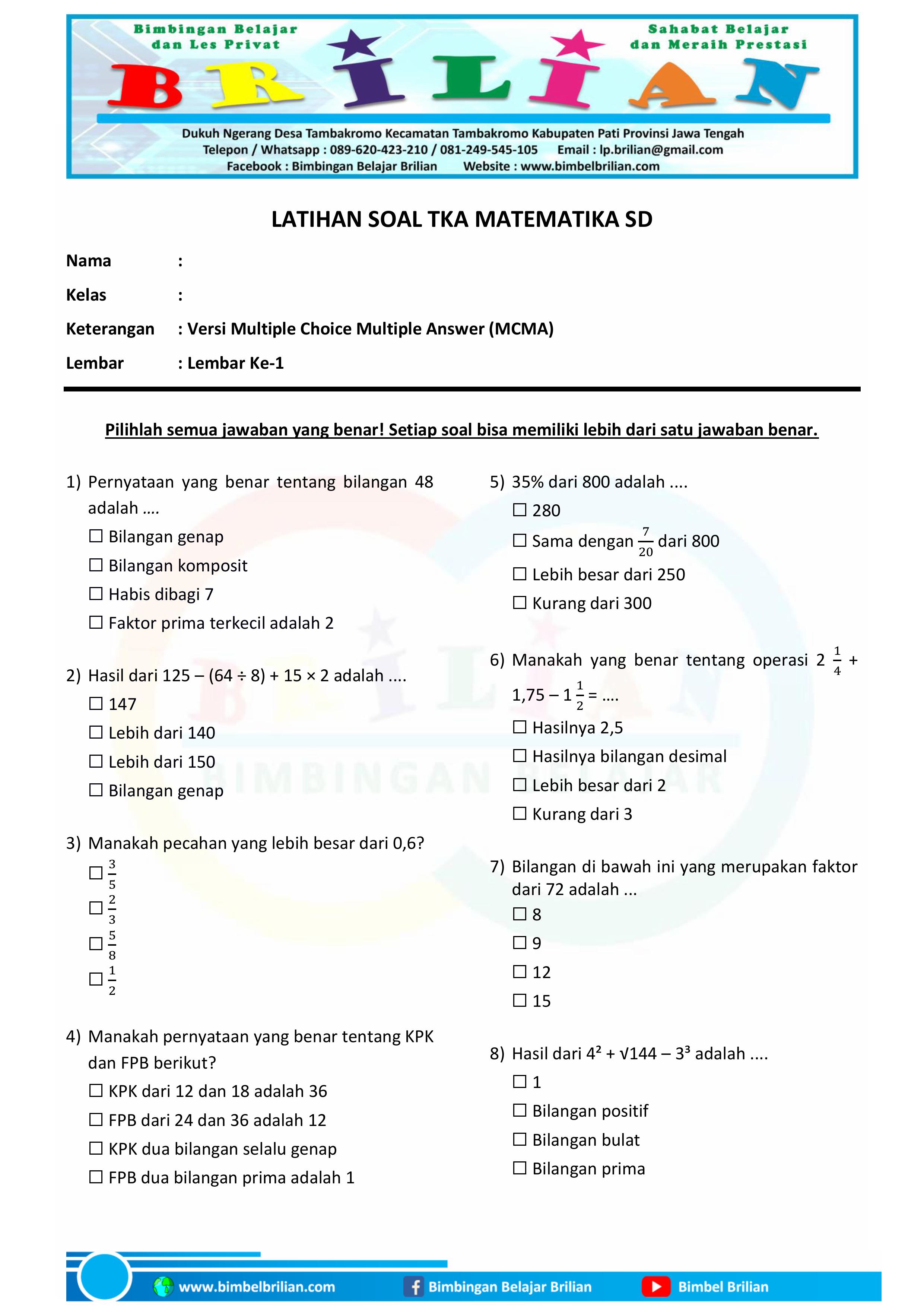 - Jenis soal : Soal TKA Matematika SD Model MCMA (Multiple Choice Multiple Answer) Lembar 1