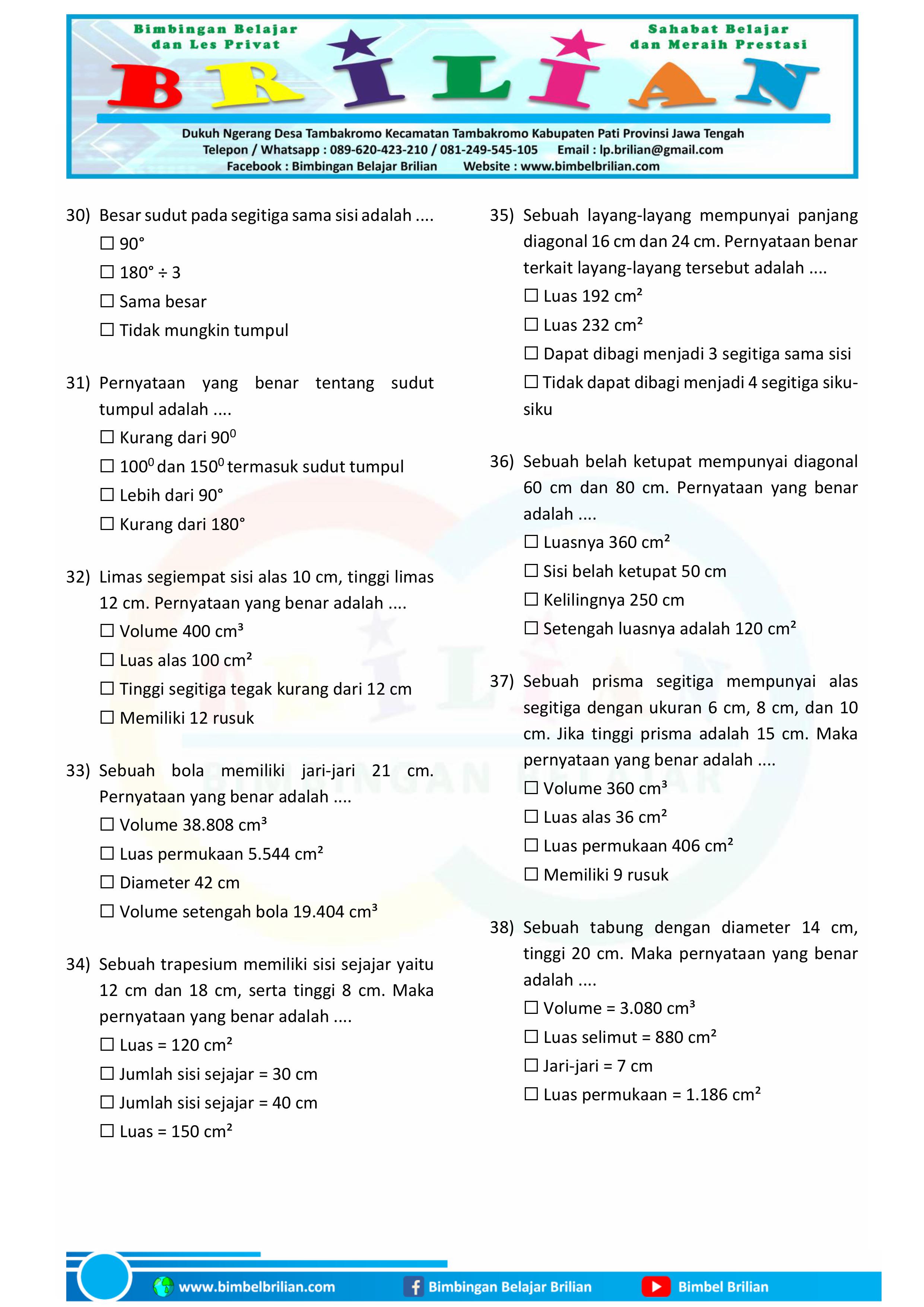 20) Sebuah balok berukuran 20 cm × 12 cm × 8 cm. Pernyataan yang benar adalah ….